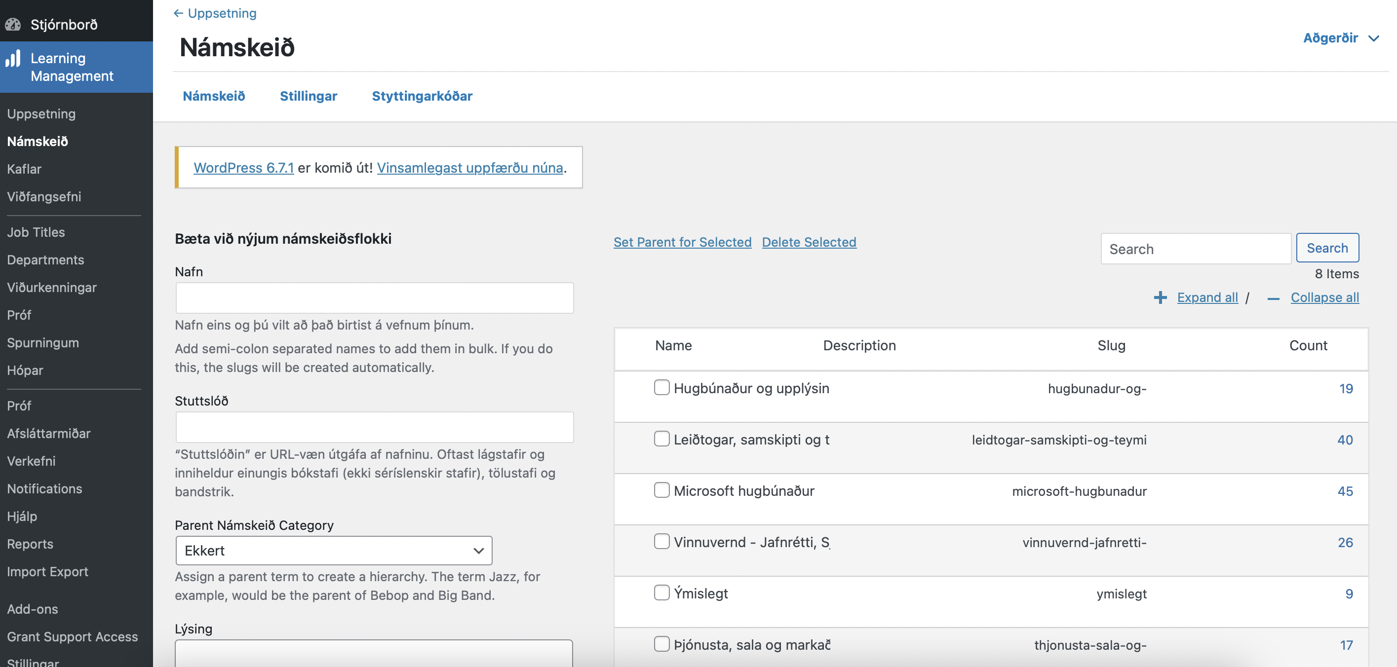 Ekki er nauðsynlegt að velja “Parent Category” eða setja inn lýsingu, nema þið viljið. Smellið svo á “Bæta við nýjum námskeiðsflokki” takkann og nýi flokkurinn mun þá birtast í listanum hægra megin á síðunni.