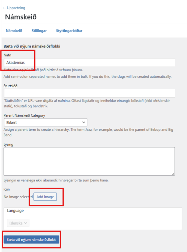 Hérna þarf að setja inn „nafn“ á námskeiðflokk. Einnig þarf að velja “stuttslóð” sem er þá yfirleitt bara nafn námskeiðsflokksins í lágstöfum, án séríslenskra bókstafa. Gott er að nota bandstrik til að aðskilja orð, í stað bils. Hægt er að bæta við mynd með því að ýta á „add image“ ef ekki á að setja inn mynd(icon) þá er ýtt á „bæta við nýjum námskeiðsflokki“ og þá hefur hann stofnast.