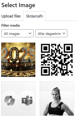 Ef setja á mynd(icon) á námskeiðsflokkin þá er valið „add image“ þar er hægt að velja úr þeim myndum sem eru til í myndasafni eða hlaða inn nýrri mynd.