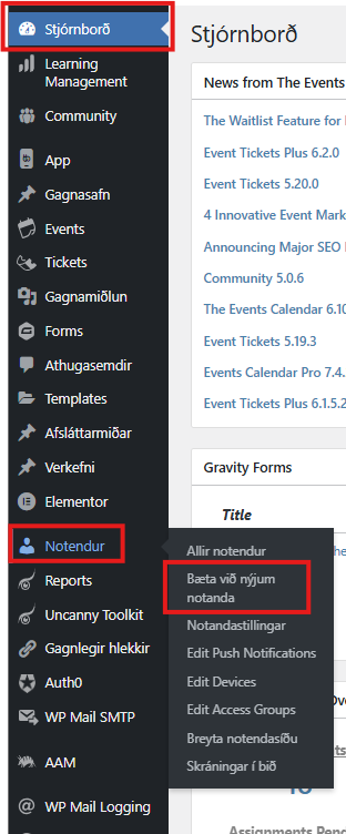 Undir “stjórnborð” er valið “notendur” og svo “Bæta við nýjum notanda”