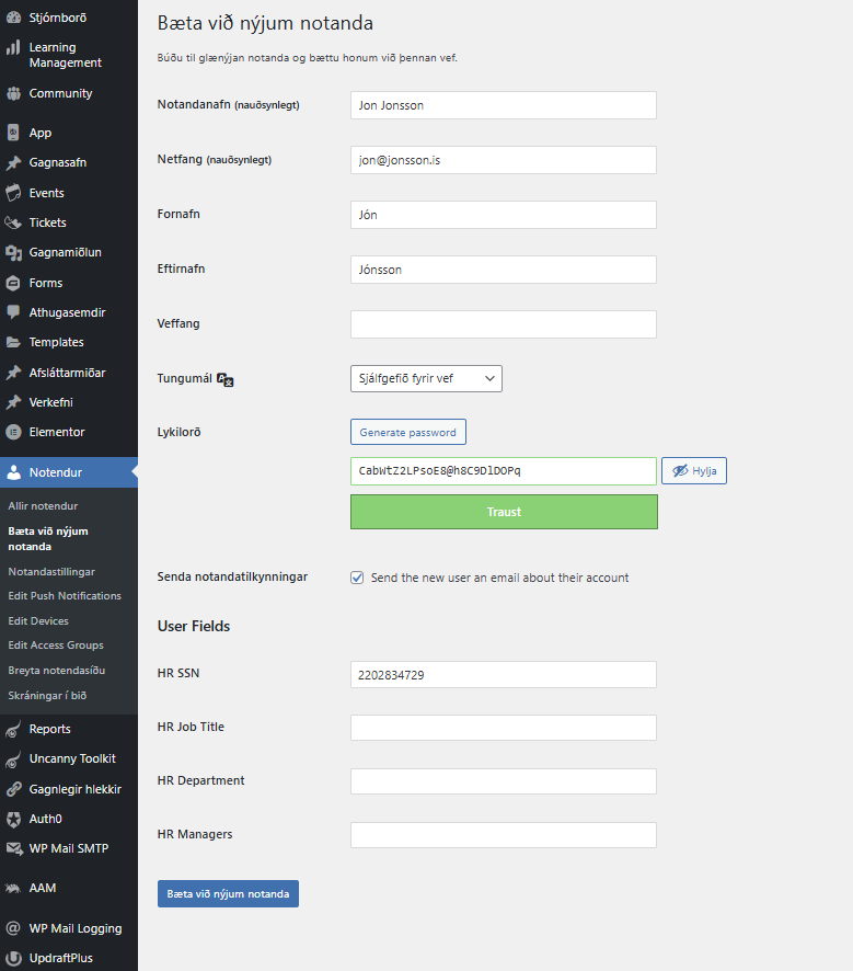 Ef notandinn á ekki að fá tilkynningu um að hann hafi verið skráður í kerfið þá er hakið tekið úr “senda notandatilkynningar” svo er ýtt á “bæta við nýjum notanda” og þá er hann komin inn í kerfið og getur skráð sig inn.