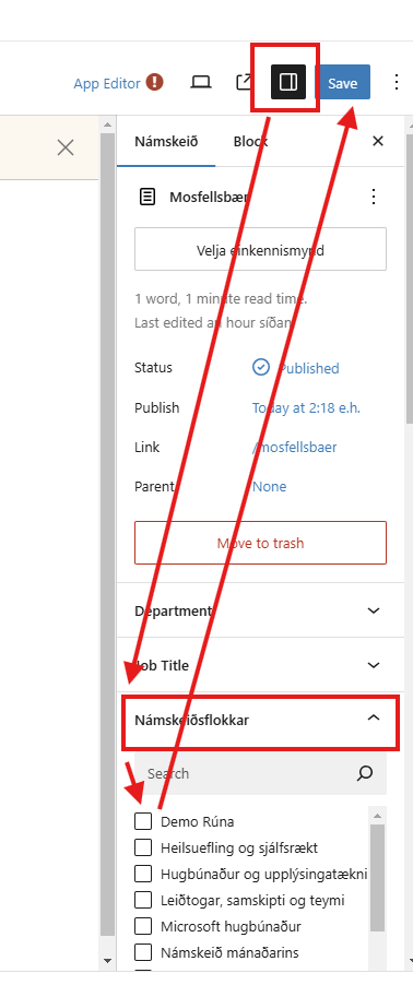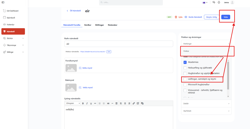 Farið er í bakendann og undir “learning management” er farið í “námskeið” þar er valið námskeiðið sem á að setja í námskeiðsflokk og undir námskeiðsheitinu er ýtt á “breyta” þar inni er ýtt á “settings”(Kassinn) hakað í þann flokk sem á að setja námskeiðið í og svo ýtt á “save” þá er námskeiðið komið í eftirfarandi flokk.