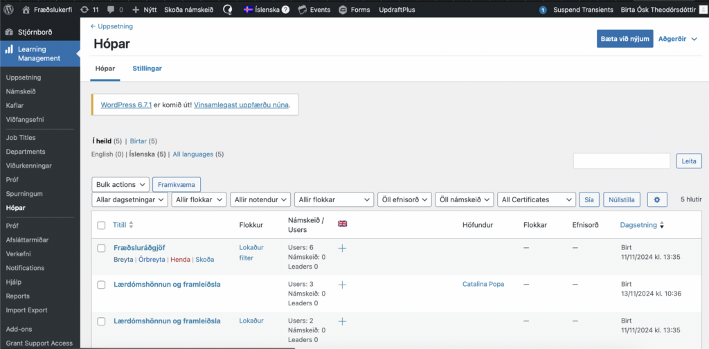 Til þess að sjá alla námshópa í kerfinu þarf að fara í bakendann, smella á “Learning management” og svo “Hópar”.