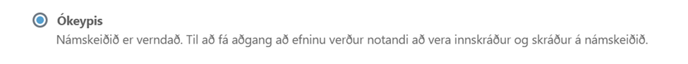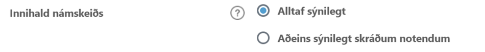Hægt er að stilla hvort innihald námskeiðs er sýnilegt öllum í kerfinu eða einungis þeim notendum sem eru skráðir í námskeiðið.