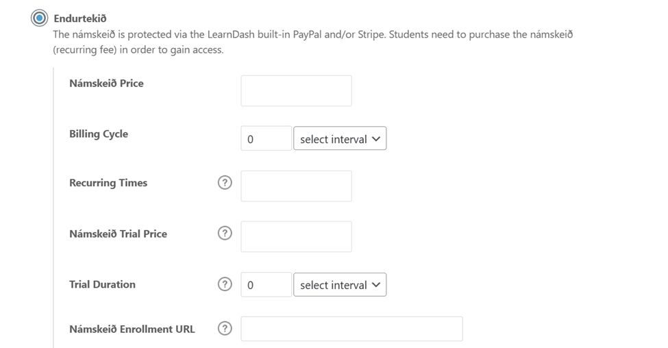 • Krefst endurtekinna gjalda (veldu gjalddaga í X dögum, vikum, mánuðum eða árum).