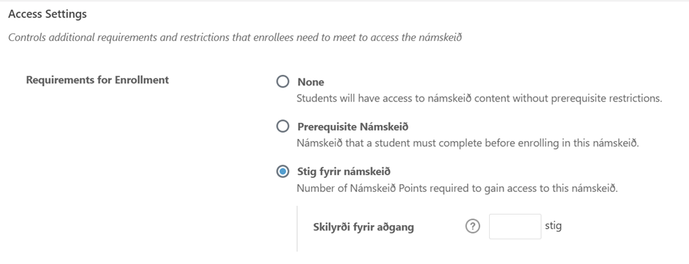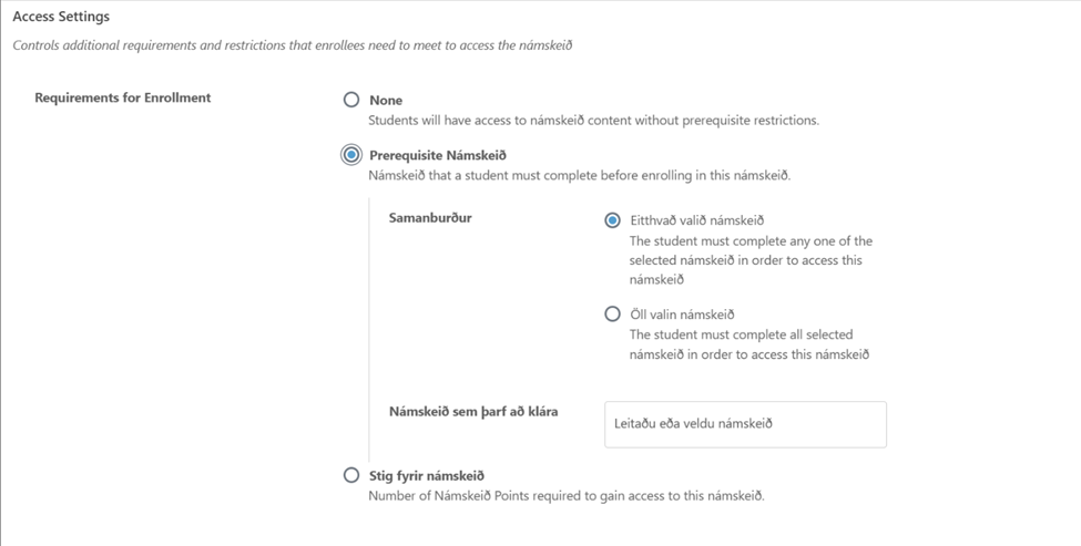 Kröfur fyrir námskeið „access settings“ hér getur þú sett upp forkröfur bakvið námskeið.