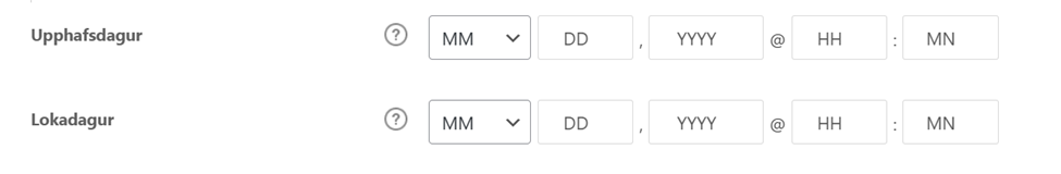 Upphafsdagur:  „Upphafsdagur“ gerir það að verkum að notendur á síðunni geta skráð sig/keypt námskeið, en þeir geta ekki byrjað á námskeiðinu fyrr en á upphafsdegi.