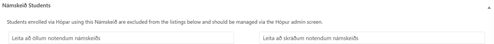Notendur námskeiðs: Þessi hluti leyfir þér að sjá hvaða notendur eru nú þegar skráðir í námskeiðið. Einnig getur þú skráð notendur eða fjarlægt þá.