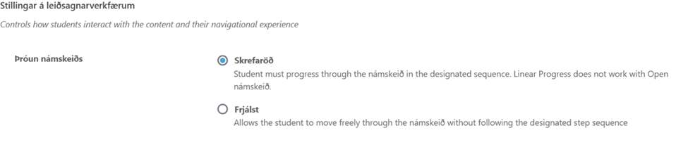 • Frjálst: Leyfir nemanda að fara í gegnum námskeiðið án þess að fylgja tilgreindri skrefaröð.