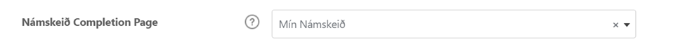 „Undir „námskeið completion page“ er hægt að stilla hvert notanda er vísað eftir að námskeiði er lokið. Ef t.d. er valið „Mín námskeið“ opnast mín námskeið síðan þegar ýtt er á „complete“ við eftirfarandi námskeið.