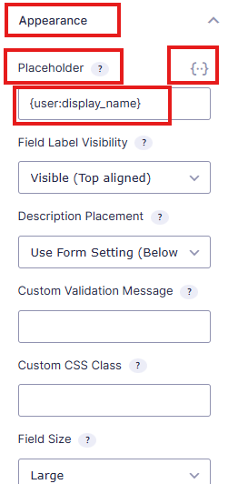 Næst er valið “Appearance” og við “Placeholder” er merki sem ýtt er á og þar er hægt að velja hvað á að birtast í dálknum þegar notandinn opnar forms. Ef valið er “{user:display_name}” þá kemur “birt nafn” notandans inn í dálkinn.