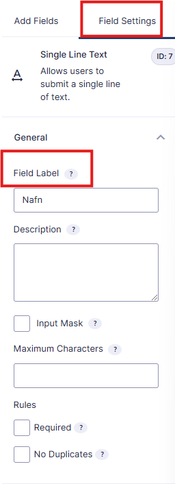 Og þar er valið “field settings” og sett inn hvað á að fara í dálkinn undir “field label”