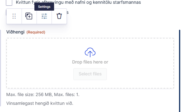 Einnig er hægt að stilla forms upp þannig að ef ekki er hakað í alla reiti þá er ekki hægt að hengja skjal við eða senda inn umsókn. Farið er í “stillingar” á viðhengi .