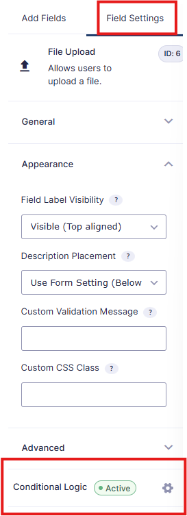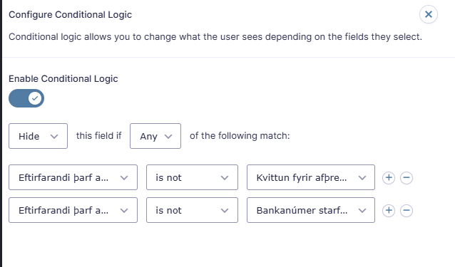 Undir “Field Settings” er valið “Conditional Logic”