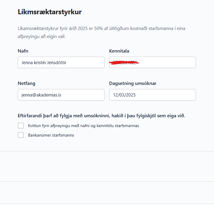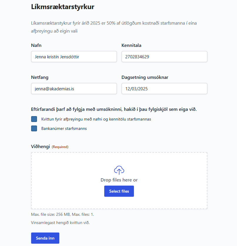 Núna er ekki hægt að senda inn umsókn nema það sé búið að haka við alla reiti og hlaða inn skjali.
