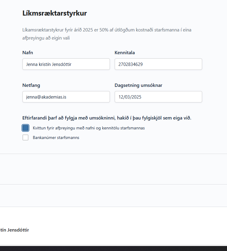 Þegar búið er til form fyrir t.d. líkamsræktarstyrk þá er hægt að stilla það þannig að kerfið fyllir inn upplýsingar um notandann. Er það gert með því opna nýtt form og þar inni undir Add fields” er valið „ Single line text”