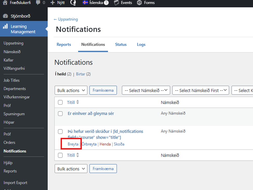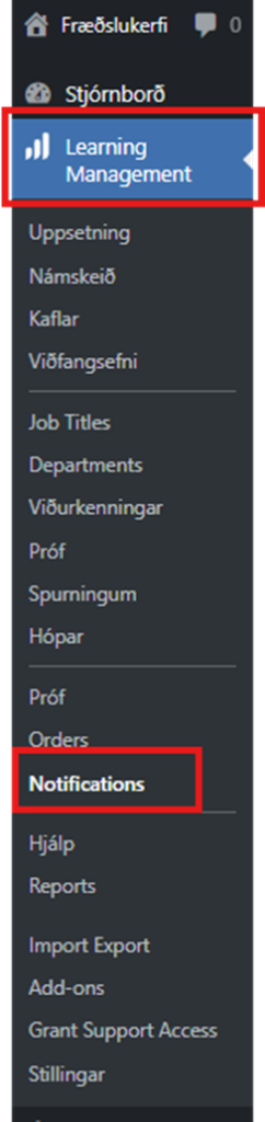 Hægt er að stilla hvort notendur fái tilkynningar í tölvupósti þegar námskeið er skráð á notandann. Byrjað er að fara í „Bakendann“ og þar undir „Learning management“ er farið í „notifacations“