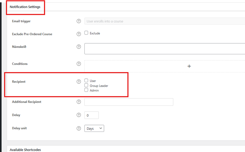 Í „Notifacation settings“ undir „Recipient“ er hakað í þá aðila sem eiga að fá tölvupóst þegar námskeið er skráð á þá notendur. Ef enginn á að fá tilkynningu í tölvupósti þá er hakið tekið af öllum í „Recipient“ og svo er ýtt á „Uppfæra”