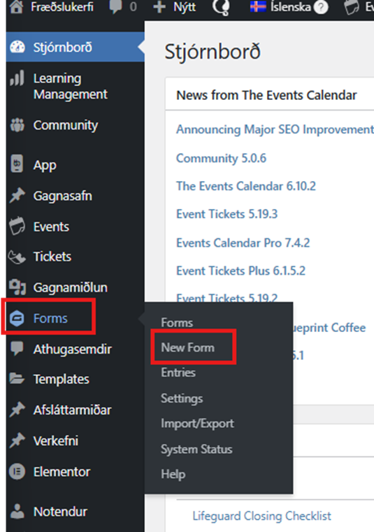 Í bakendanum er hægt er að búa til tékklista undir “forms” og valið “new Form”