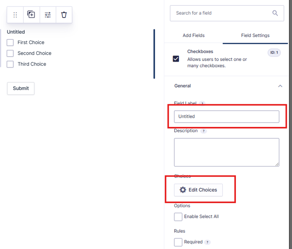 Undir “Field label” er sett inn heitið og svo er farið í “Edit Choices” og valmöguleikunum breytt.