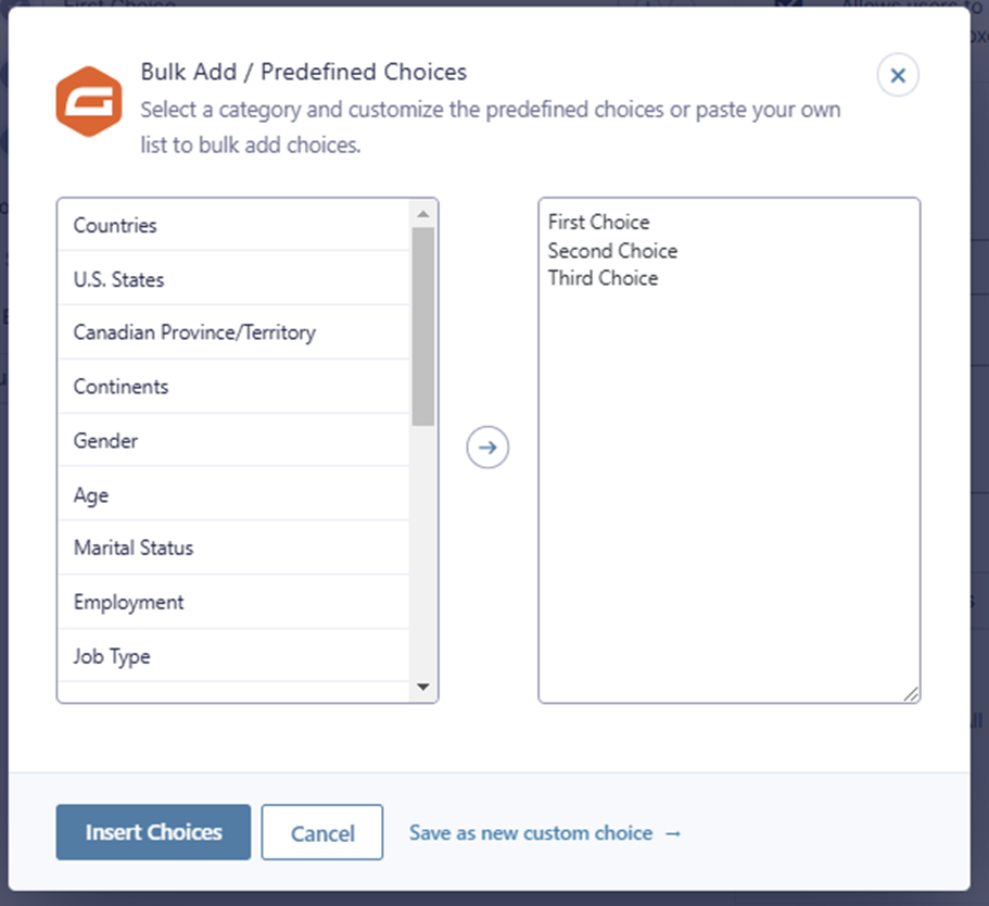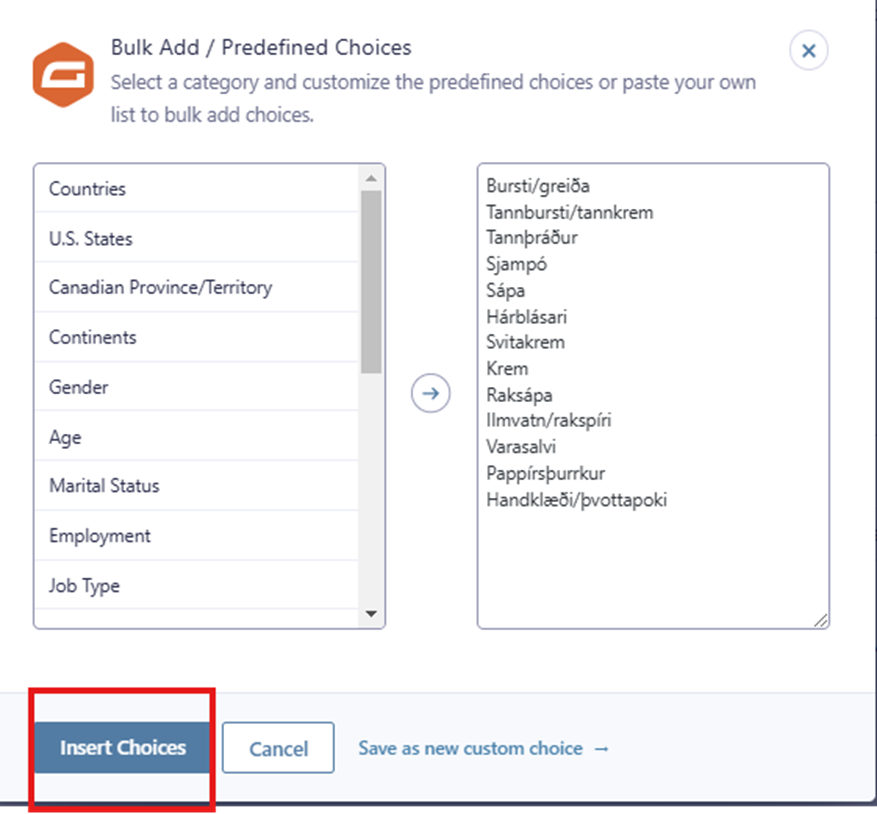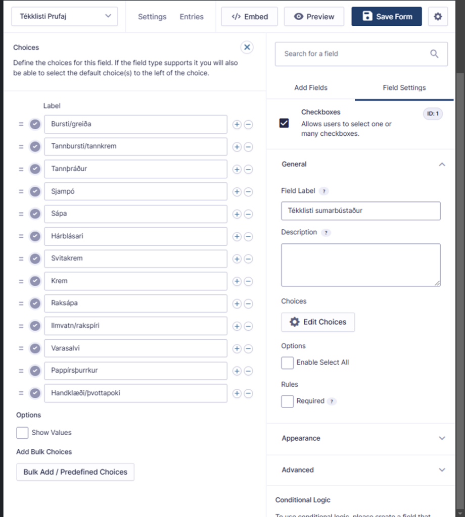 Í “Edit Choices” er hægt að skrifa inn nafn hvers valmöguleika, ef ýtt er á „Bulk Add / Predefined Choices“ er hægt að setja inn alla hluti sem eiga að vera inni á tékklistanum.