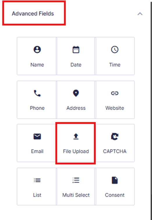 Einnig er hægt að bæta við skjali í Tékklistann. Þá er farið í “advanced fields” og valið “file upload”